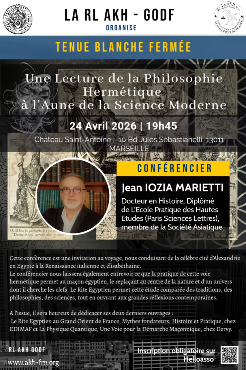 Cette conférence est une invitation au voyage, nous conduisant de la célèbre cité d’Alexandrie en Egypte à la Renaissance italienne et élisabéthaine. Le conférencier nous laissera également entrevoir ce que la pratique de cette voie hermétique permet au maçon égyptien, le replaçant au centre de la nature et d’un univers dont il cherche les clefs. Le Rite Egyptien permet cette étude comparée des traditions, des philosophies, des sciences, tout en ouvrant aux grandes réflexions contemporaines.